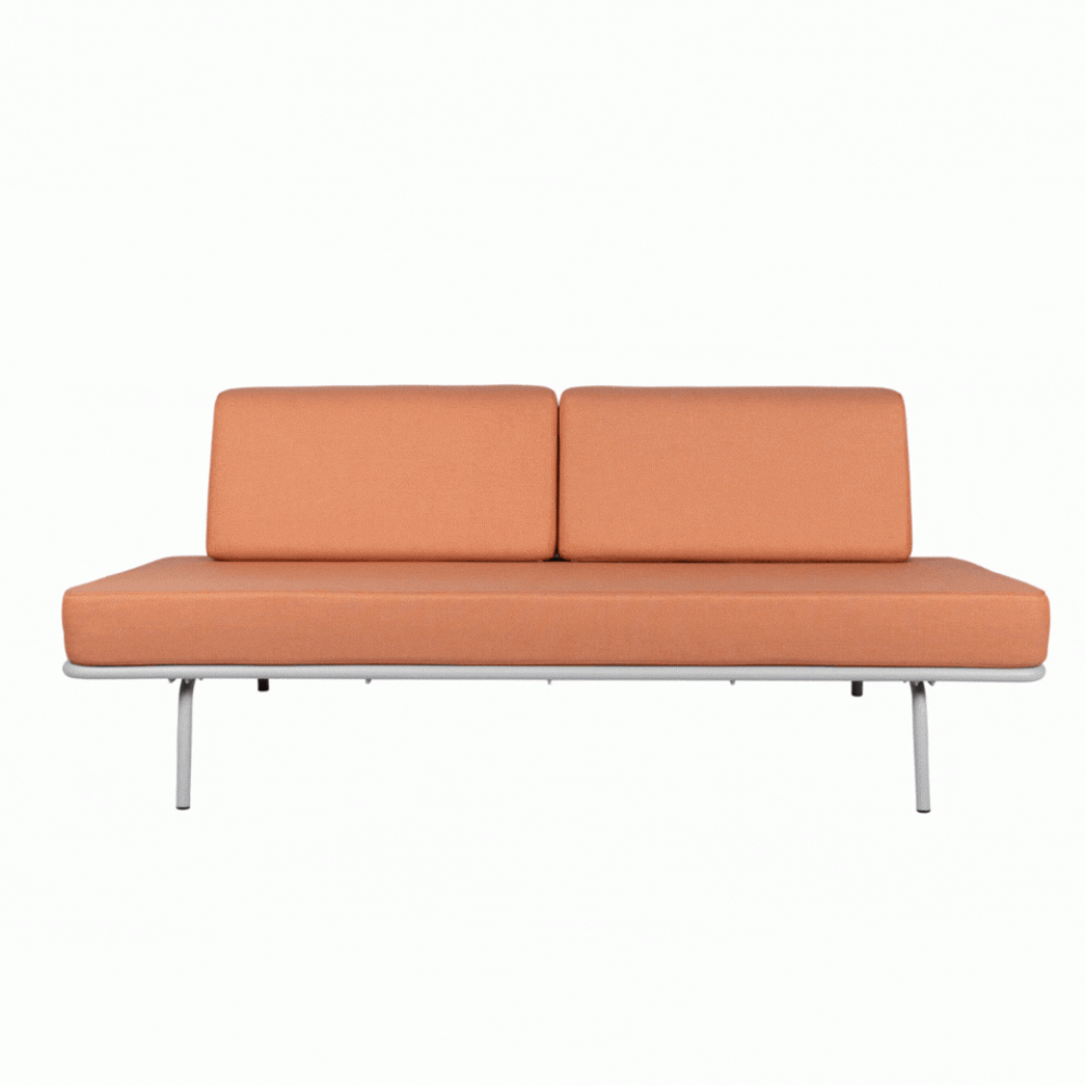 Het Sofabed van designer Hade Steenwinkel is ontworpen vanuit het idee om op dezelfde bank zowel comfortabel te kunnen zitten als slapen. Het Sofabed frame is verkrijgbaar in twee kleuren en het matras en de kussens zijn verkrijgbaar in Light Grey en Faded Orange.