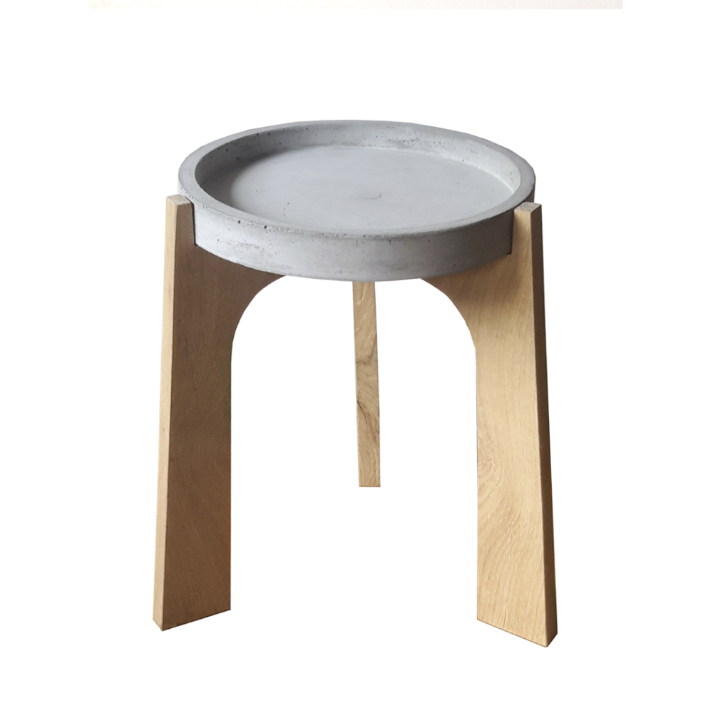 Salon of bijzettafel van eikenhout met een betonnen blad met opstaande rand. In twee maten verkrijgbaar; een hoger smal model en een laag model met groot blad.